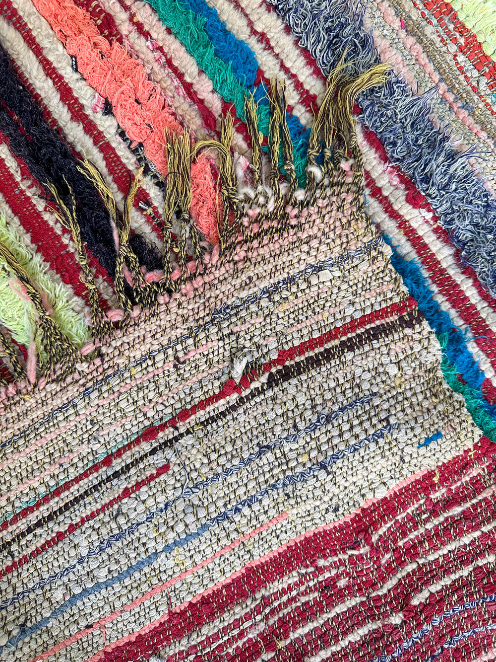 This rug technique is called Boucherouite (pronounced boo-shay-reet). These pieces are made from yarn, recycled clothing, or even textile scraps. Boucherouite rugs are often used in weavers’ own homes. In fact, this style of rug wasn’t traditionally sold but their vibrant, playful nature has made them popular.