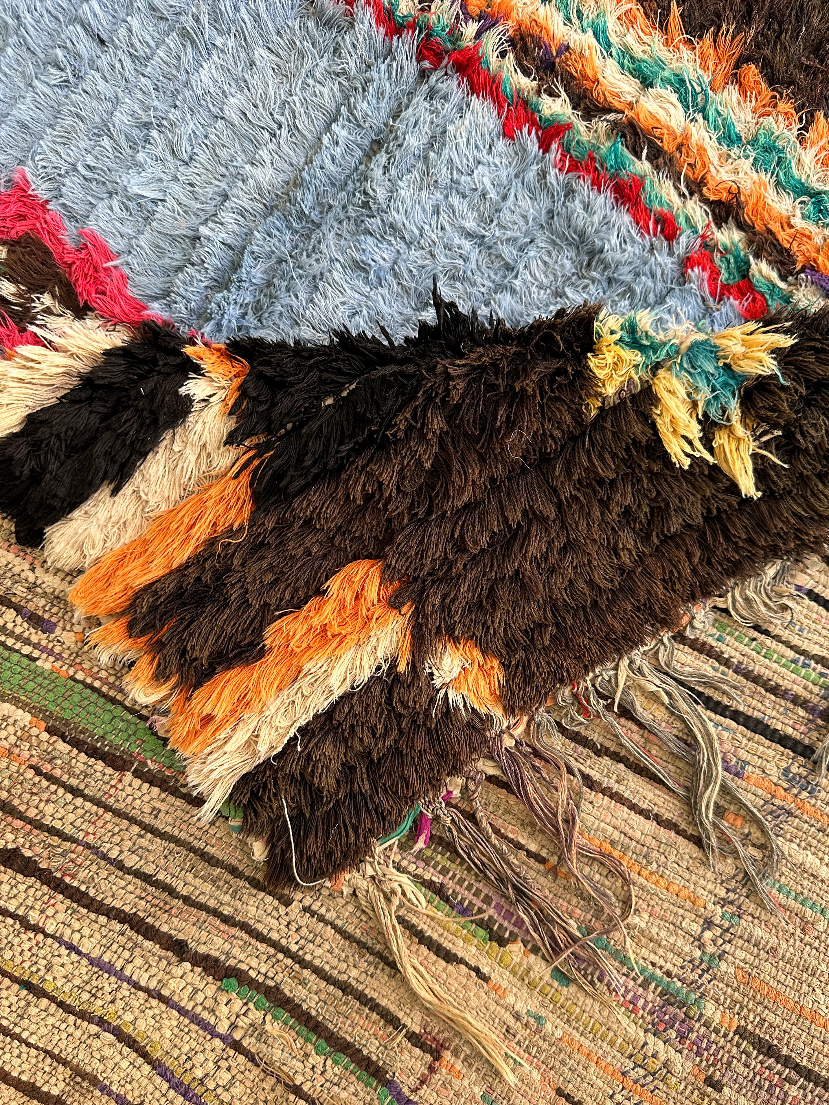 This rug technique is called Boucherouite (pronounced boo-shay-reet). These pieces are made from yarn, recycled clothing, or even textile scraps. Boucherouite rugs are often used in weavers’ own homes. In fact, this style of rug wasn’t traditionally sold but their vibrant, playful nature has made them popular.