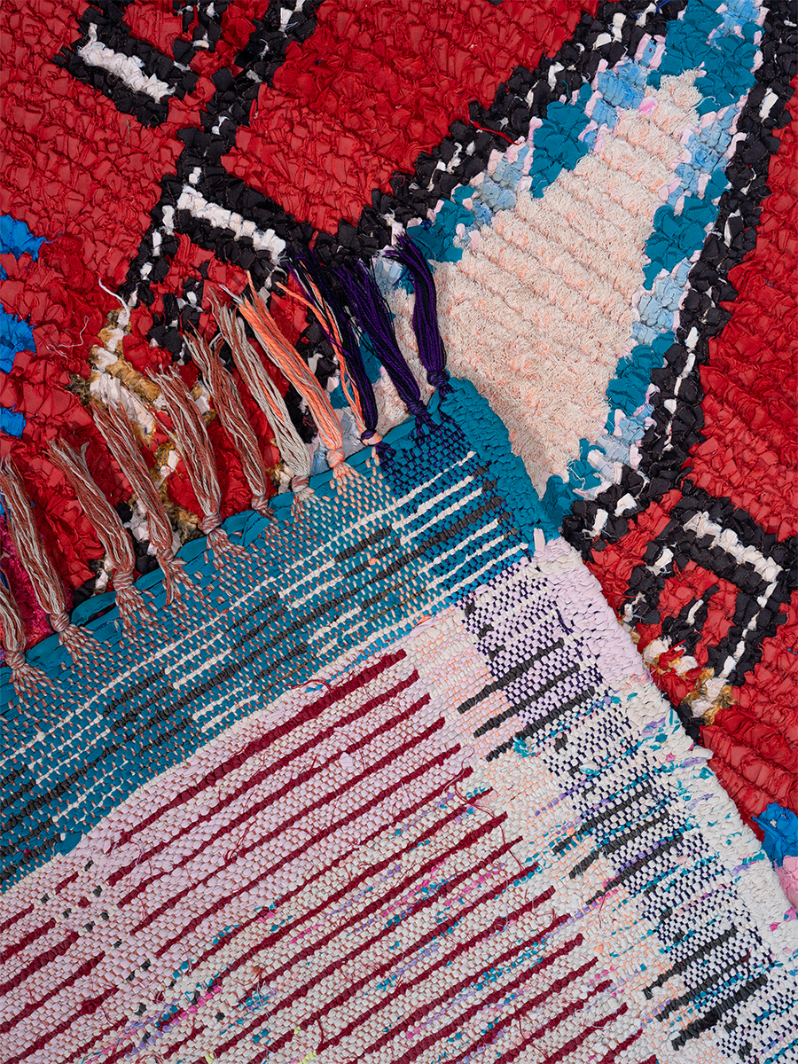 This rug technique is called Boucherouite (pronounced boo-shay-reet). These pieces are made from yarn, recycled clothing, or even textile scraps. Boucherouite rugs are often used in weavers’ own homes. In fact, this style of rug wasn’t traditionally sold but their vibrant, playful nature has made them popular.