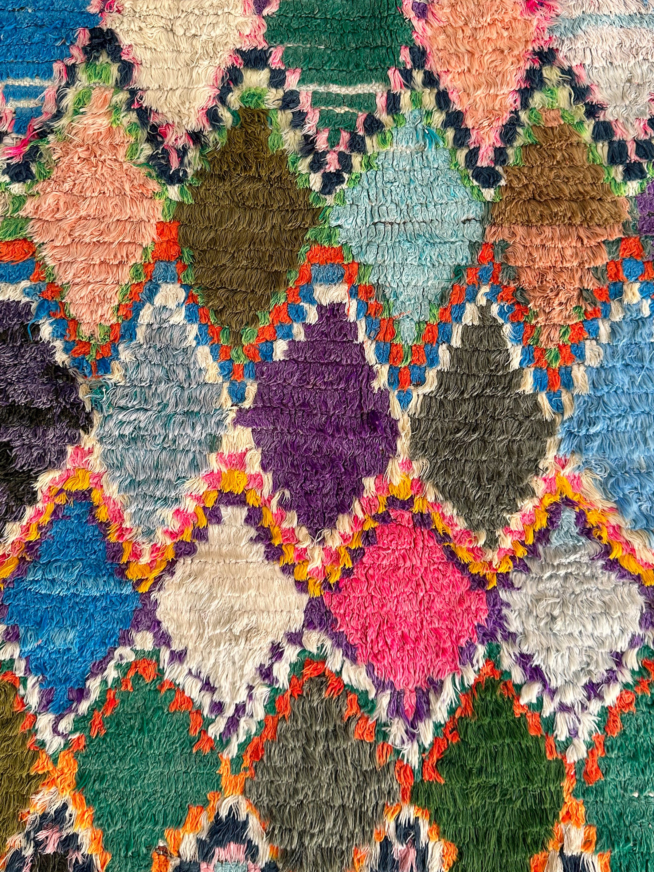 This rug technique is called Boucherouite (pronounced boo-shay-reet). These pieces are made from yarn, recycled clothing, or even textile scraps. Boucherouite rugs are often used in weavers’ own homes. In fact, this style of rug wasn’t traditionally sold but their vibrant, playful nature has made them popular.