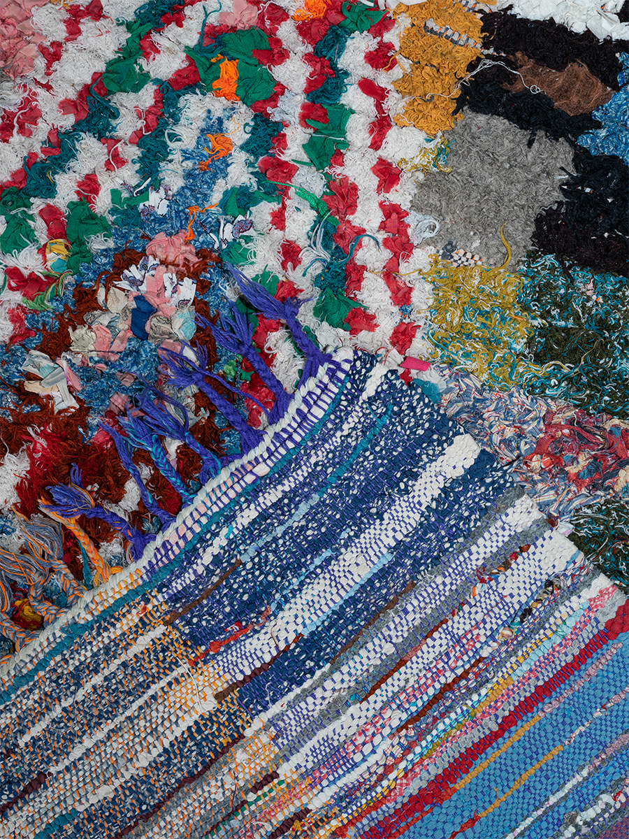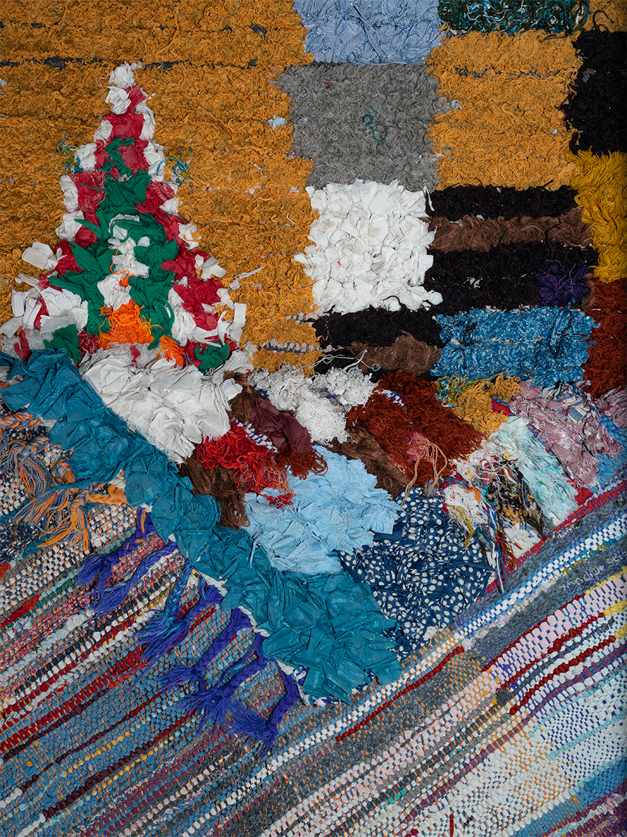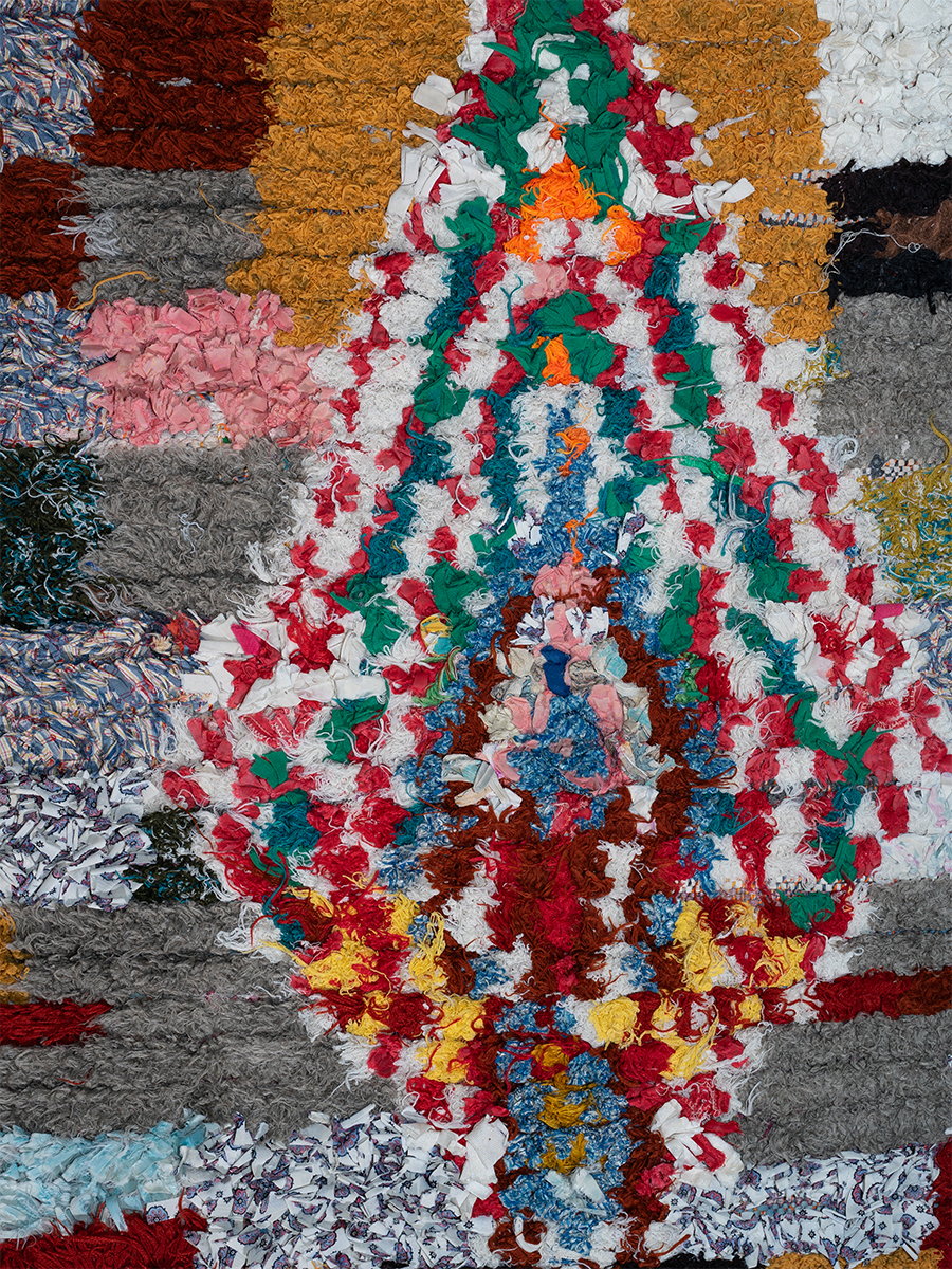 This rug technique is called Boucherouite (pronounced boo-shay-reet). These pieces are made from yarn, recycled clothing, or even textile scraps. Boucherouite rugs are often used in weavers’ own homes. In fact, this style of rug wasn’t traditionally sold but their vibrant, playful nature has made them popular.