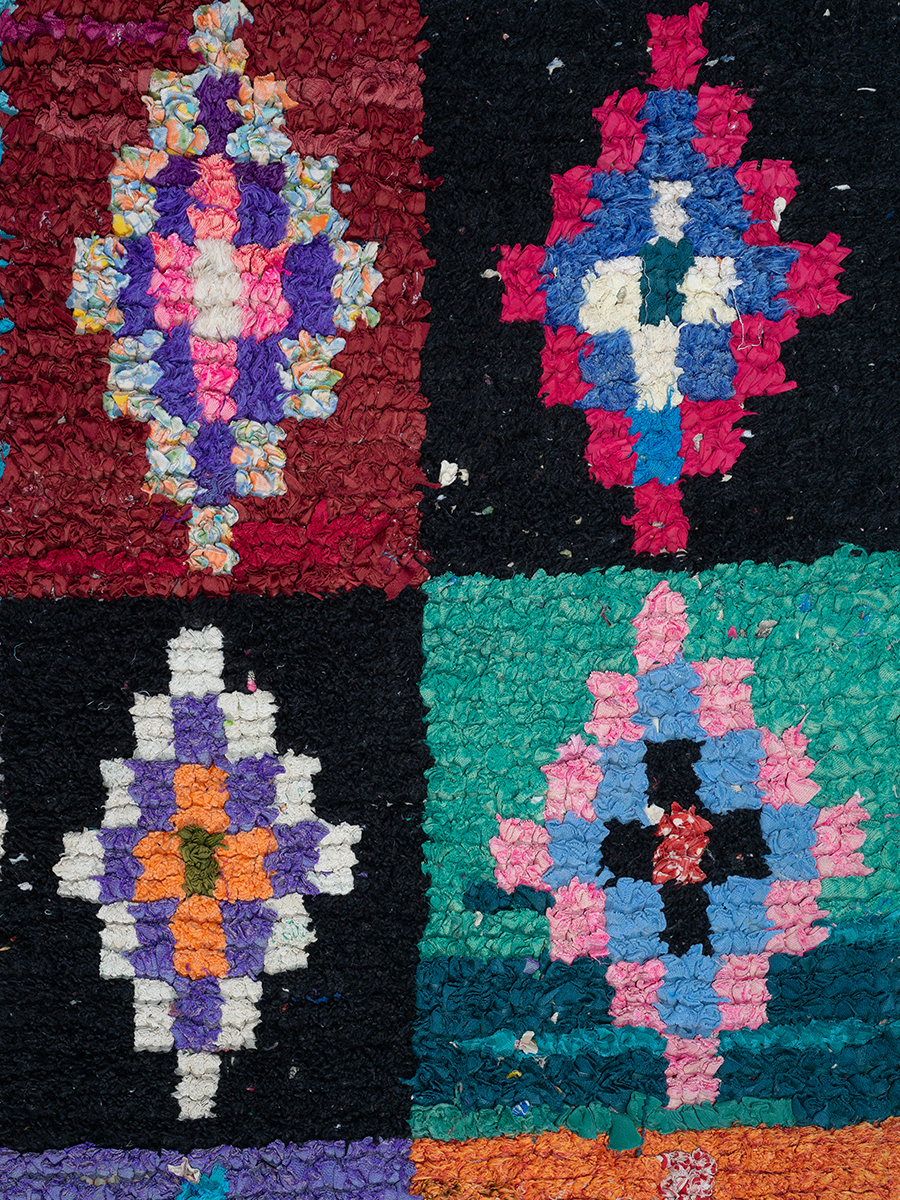 This rug technique is called Boucherouite (pronounced boo-shay-reet). These pieces are made from yarn, recycled clothing, or even textile scraps. Boucherouite rugs are often used in weavers’ own homes. In fact, this style of rug wasn’t traditionally sold but their vibrant, playful nature has made them popular.