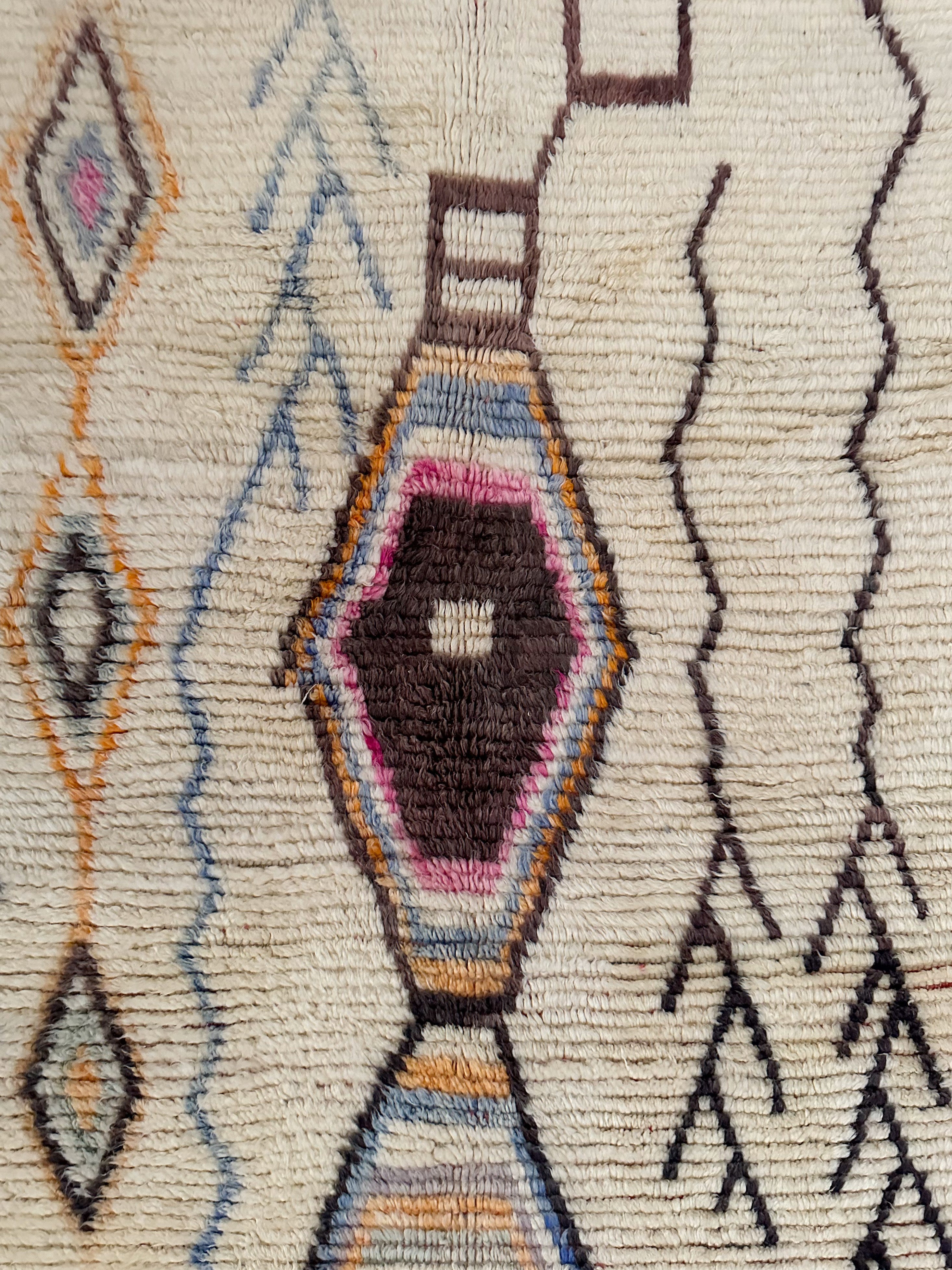 Boujad rugs originate from the Al Haouz region of Morocco and are celebrated for their distinctive and vibrant aesthetic. These rugs often showcase a myriad of bold colors. One of the defining features of Boujad rugs is their use of geometric shapes, abstract forms, and symbolic motifs passed down through generations, each telling a story of the weaver's cultural heritage and artistic expression. The weaving technique results in a less dense pile compared to other Moroccan rugs, giving them a distinct texture.