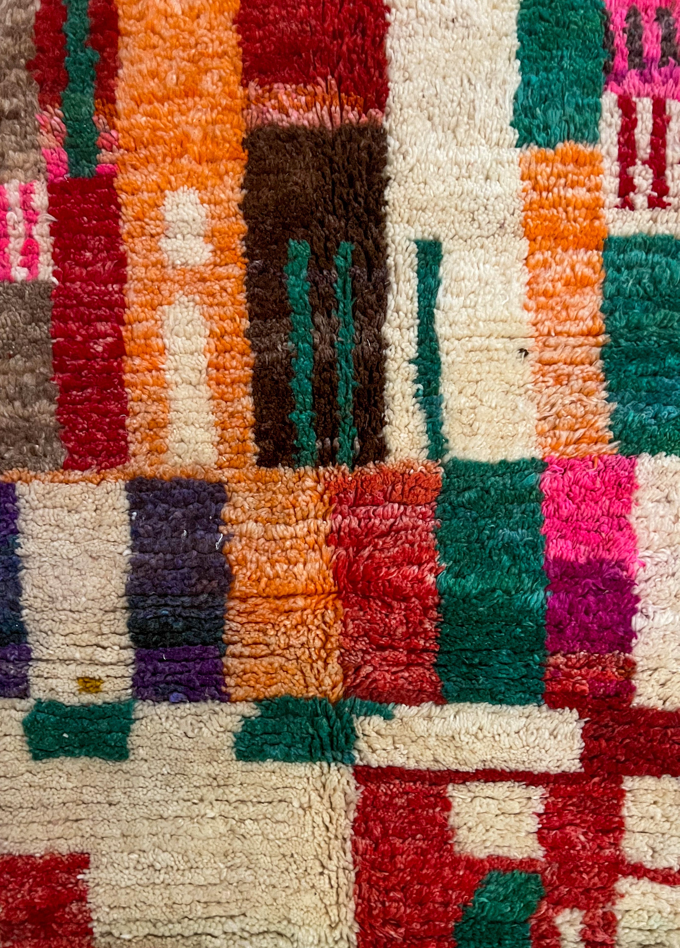 Boujad rugs originate from the Al Haouz region of Morocco and are celebrated for their distinctive and vibrant aesthetic. These rugs often showcase a myriad of bold colors. One of the defining features of Boujad rugs is their use of geometric shapes, abstract forms, and symbolic motifs passed down through generations, each telling a story of the weaver's cultural heritage and artistic expression. The weaving technique results in a less dense pile compared to other Moroccan rugs, giving them a distinct texture.