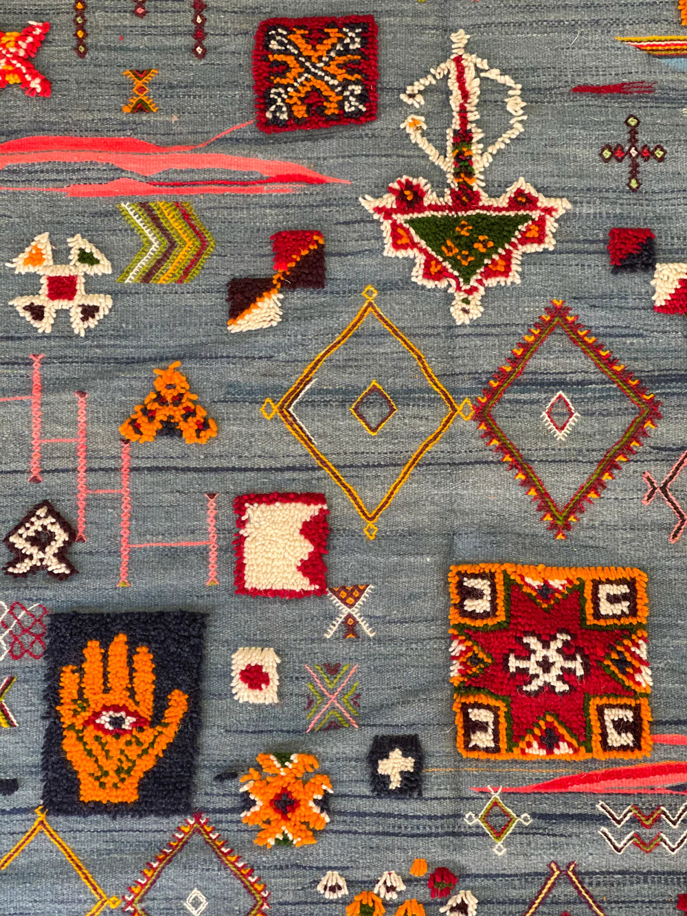 This style is thought to originate from the area in and around the Village of Tazenakht, an area rich with a weaving history. While the majority of this weave is flat, the design accents are either embroidered or have a slightly higher pile, giving this piece texture and dimension. Every design element comes entirely from the artisan’s imagination. The design elements within this technique tend to depict an array of symbolism in the Amazigh culture.