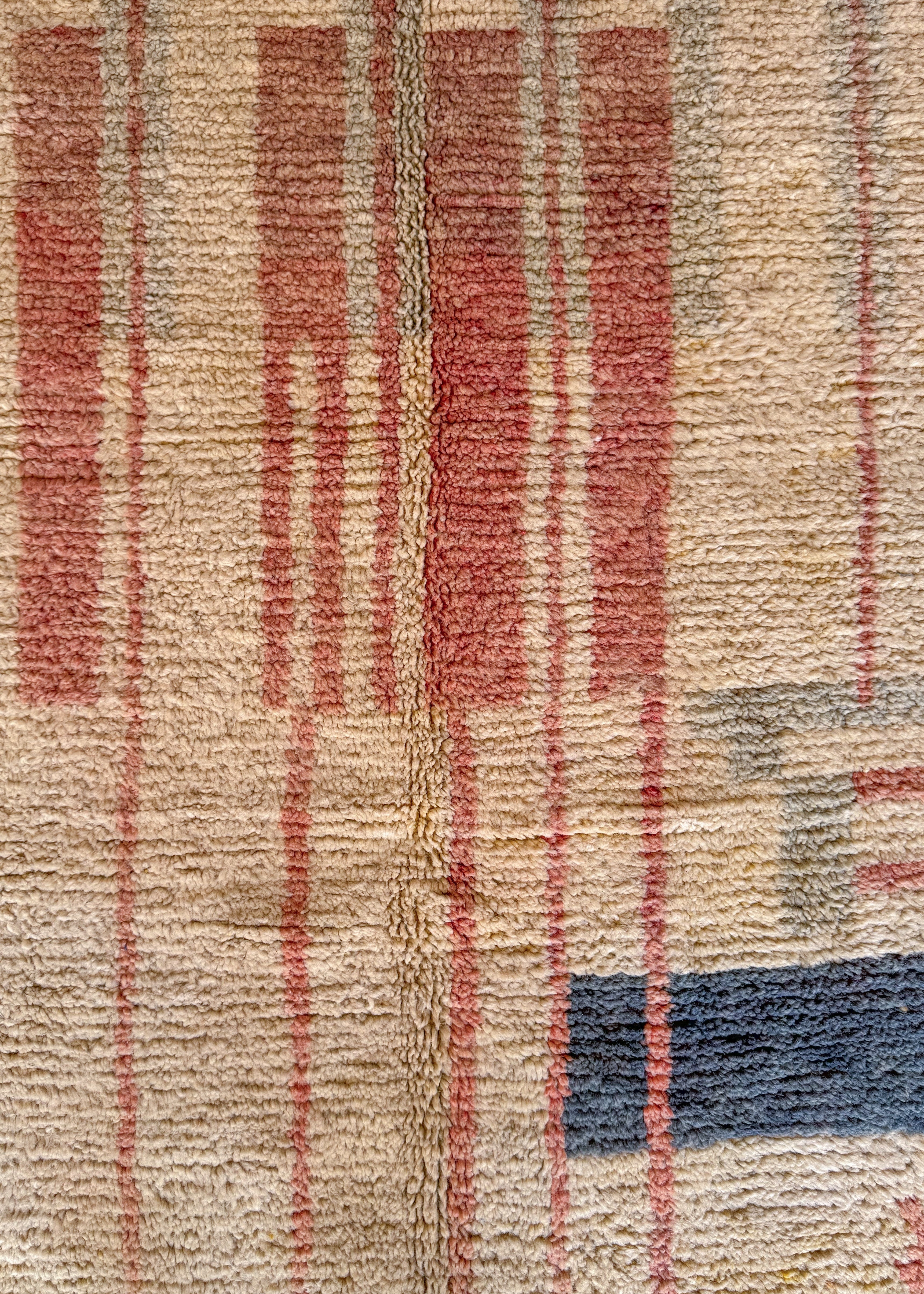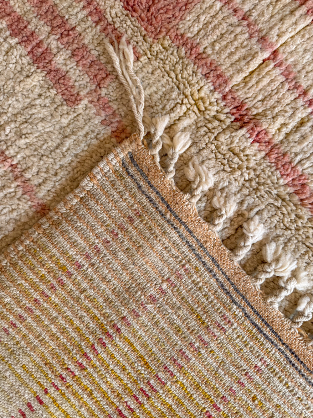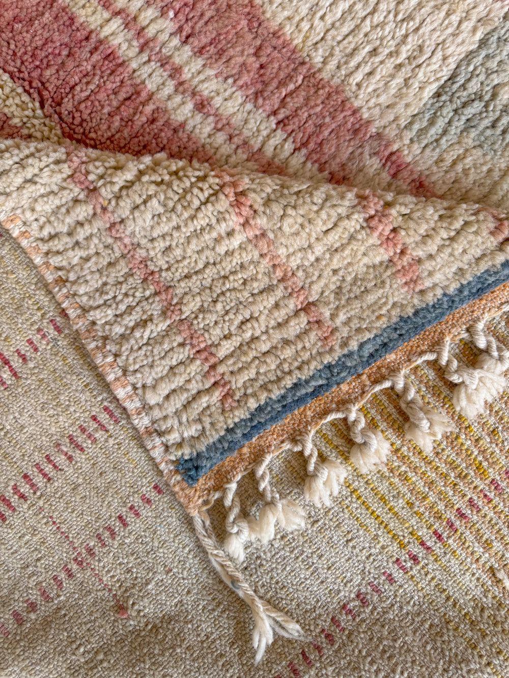 Boujad rugs originate from the Al Haouz region of Morocco and are celebrated for their distinctive and vibrant aesthetic. These rugs often showcase a myriad of bold colors. One of the defining features of Boujad rugs is their use of geometric shapes, abstract forms, and symbolic motifs passed down through generations, each telling a story of the weaver's cultural heritage and artistic expression. The weaving technique results in a less dense pile compared to other Moroccan rugs, giving them a distinct texture.