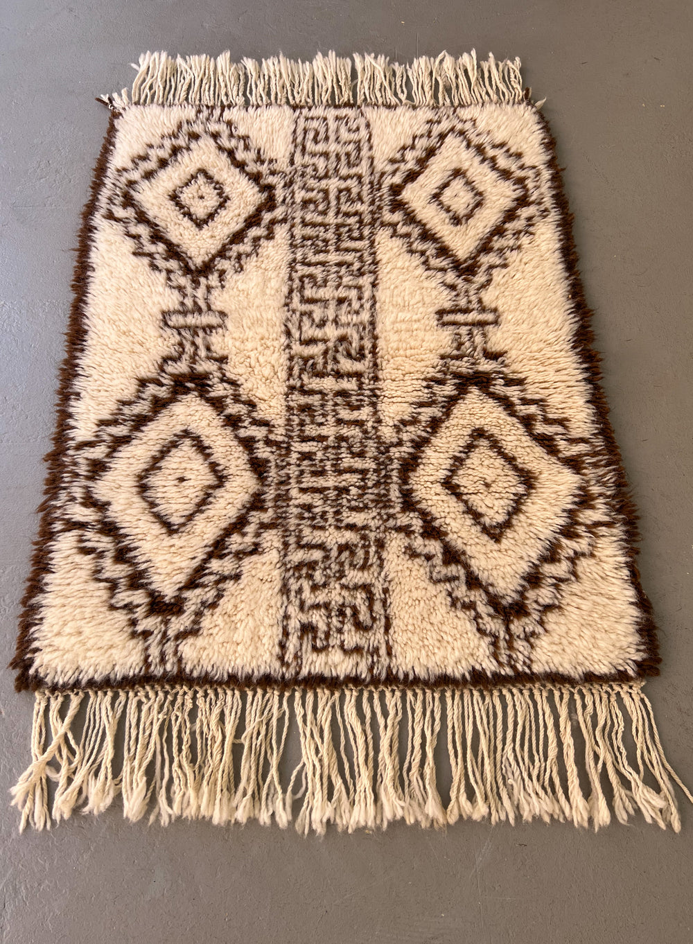 A small independent Association of artisans who reside in Marmoucha, a Village located north of Morocco and sits just south of Fez, has a total of 10 weavers. Marmoucha sits in the region where the infamous Beni Ourain Tribe once lived. Hence, the traditional Medium to High Hand-Knot rug.